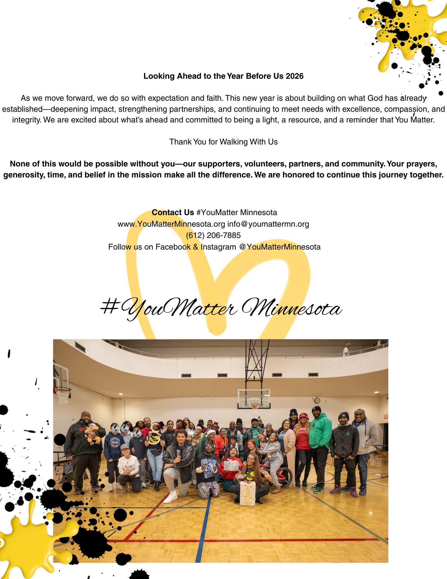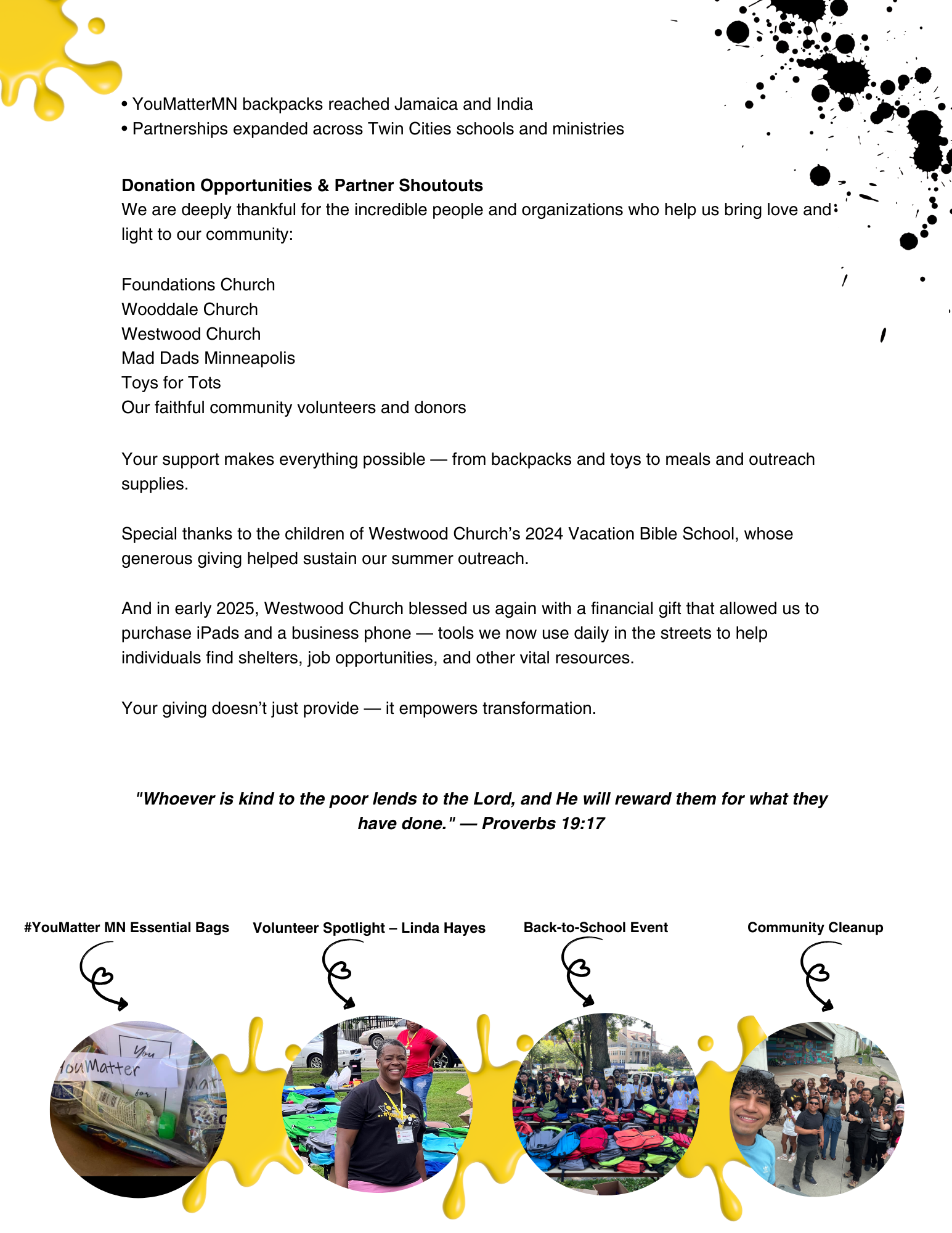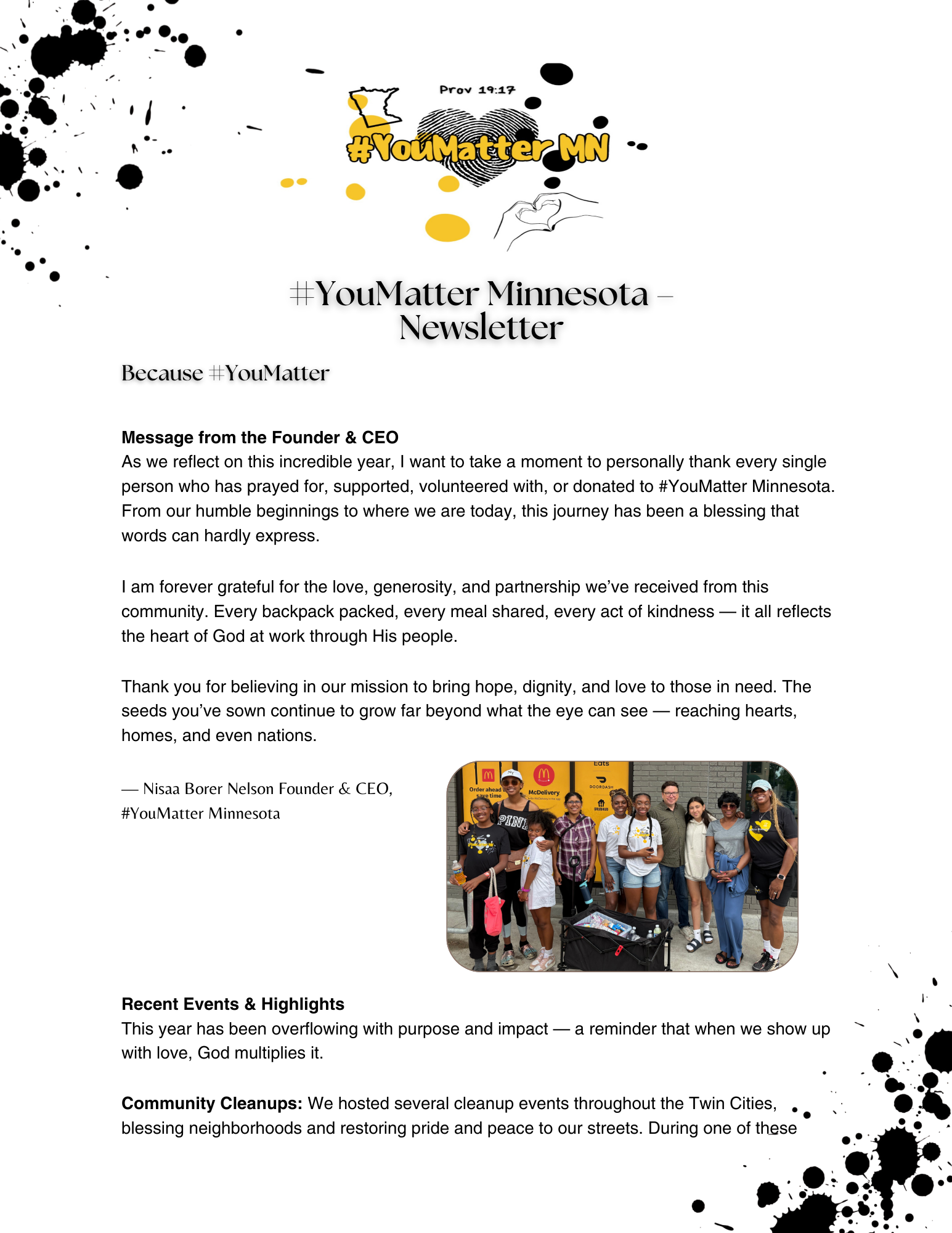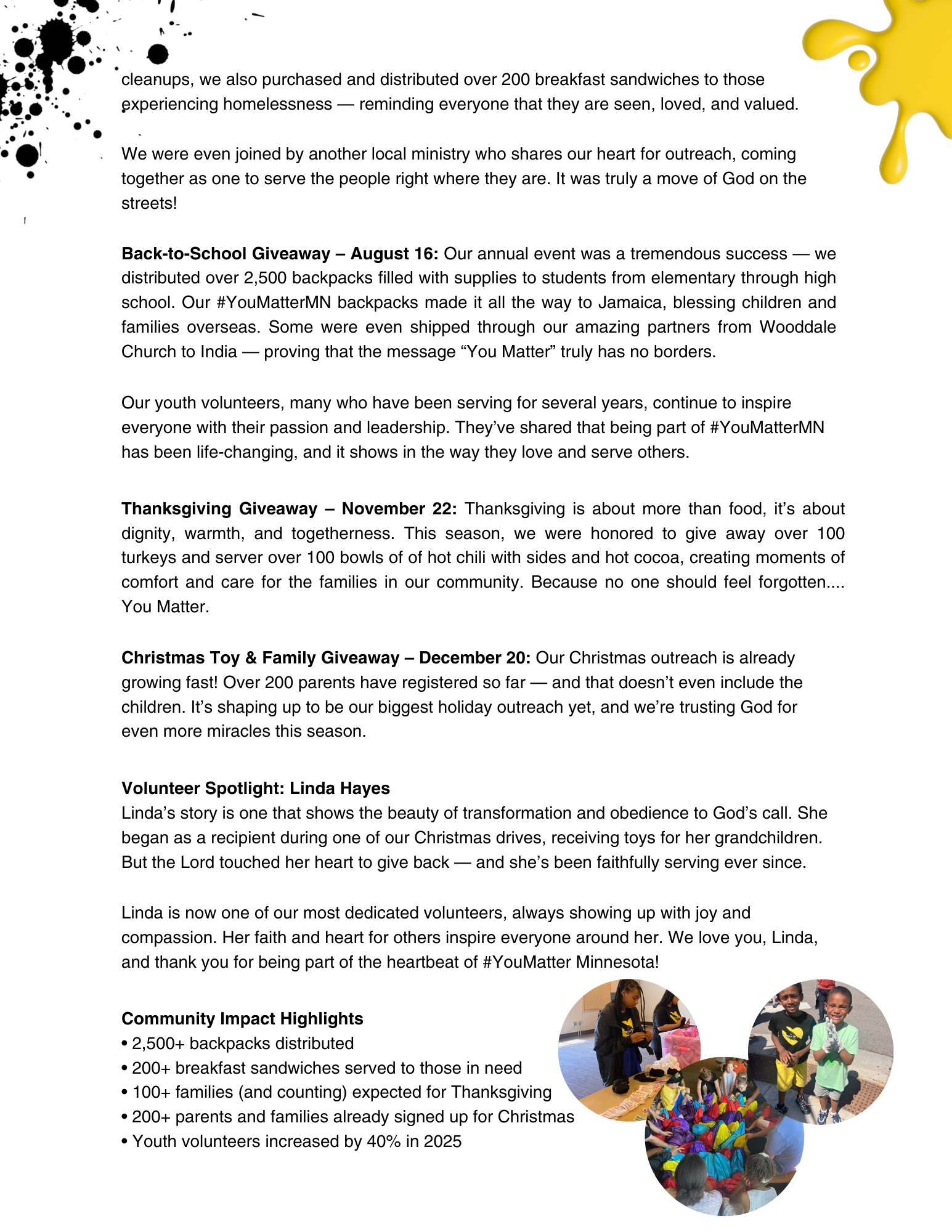 Serving the Twin Cities since 2018, #YouMatter Minnesota shares love, hope, and essentials—clothes, shoes, food, school supplies—with neighbors in need. Through street outreach, cleanups, and holiday drives, we remind every person: YOU matter. Rooted in community and inspired by Jesus, we build connections and spark hope—one caring act at a time.