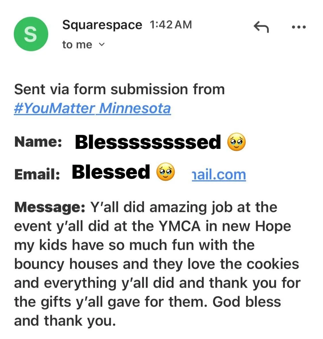 #YouMatter Minnesota had it’s inception on August 4th, 2018. #YMMN is a nonprofit organization dedicated to serving the community through various initiatives. We provide essential support to the homeless by offering meals and distributing #YouMatter essential bags filled with food and supplies. Additionally, we offer prayers for those seeking spiritual comfort and support through the LOVE of JESUS CHRIST. Our mission is to bring hope to individuals and families affected by poverty and homelessness. In addition to our direct support for the homeless, we are committed to enhancing the overall well-being of our community. We organize clean-up efforts to remove trash and improve the cleanliness of public spaces. Furthermore, we host annual drives, including a back-to-school drive, a Thanksgiving drive providing turkeys and groceries, and a Christmas drive distributing toys to families in need. Through these initiatives, #YouMatter Minnesota aims to make a meaningful impact in the lives of those facing adversity, offering a helping hand and a message of hope to those who need it most!